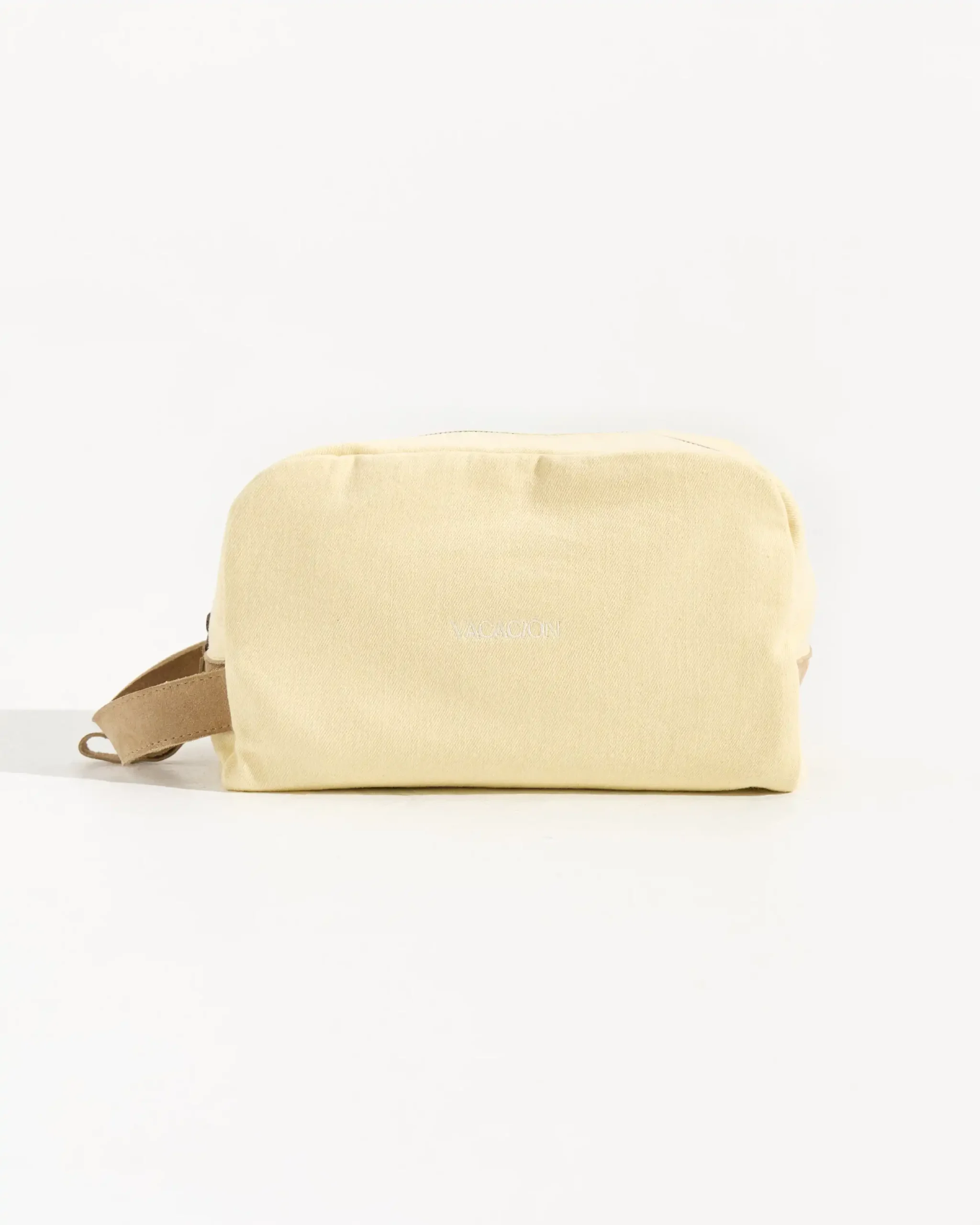 Neceser confeccionado con fibras naturales y detalle de cuero gamuzado. Contiene un boslillo interior.