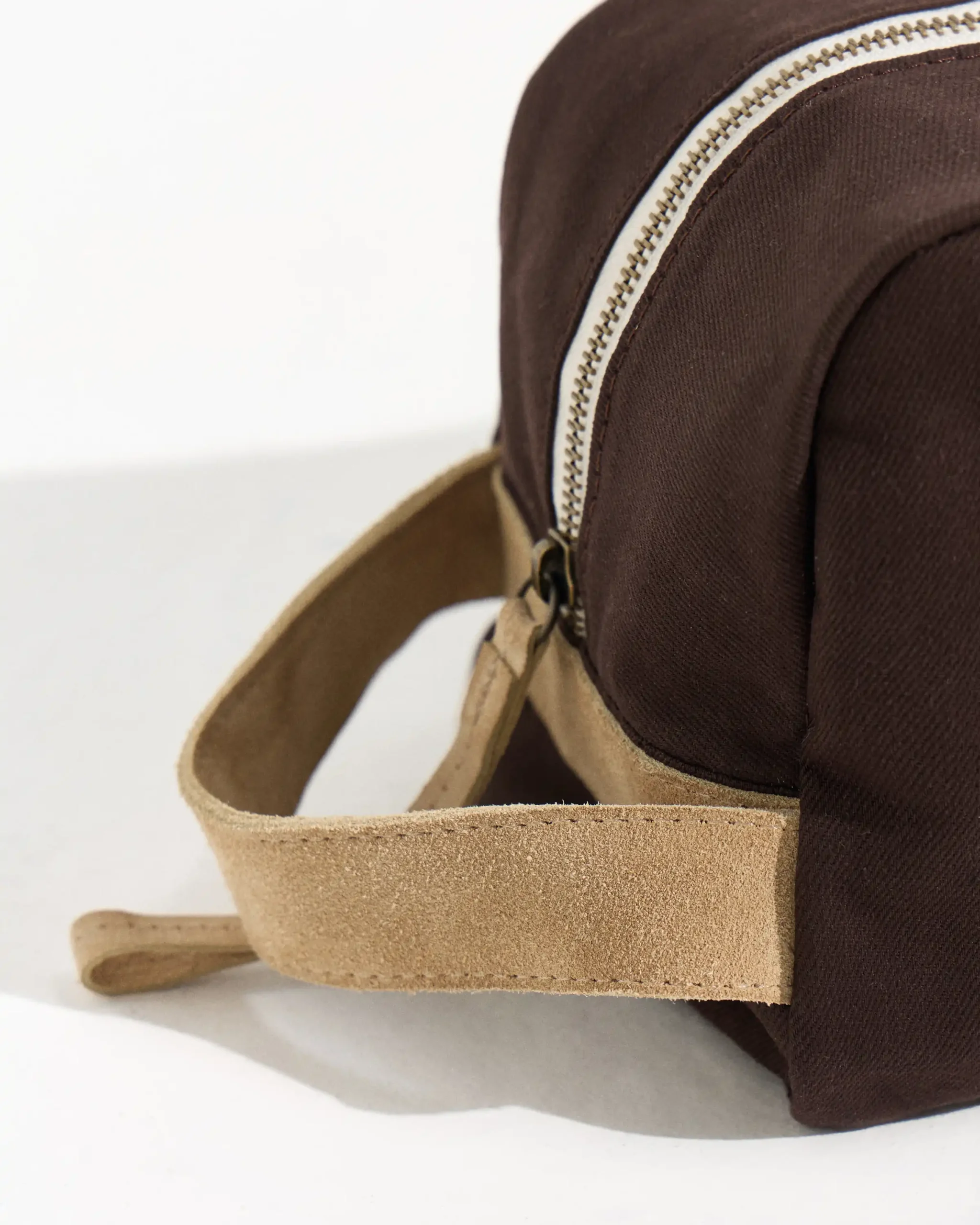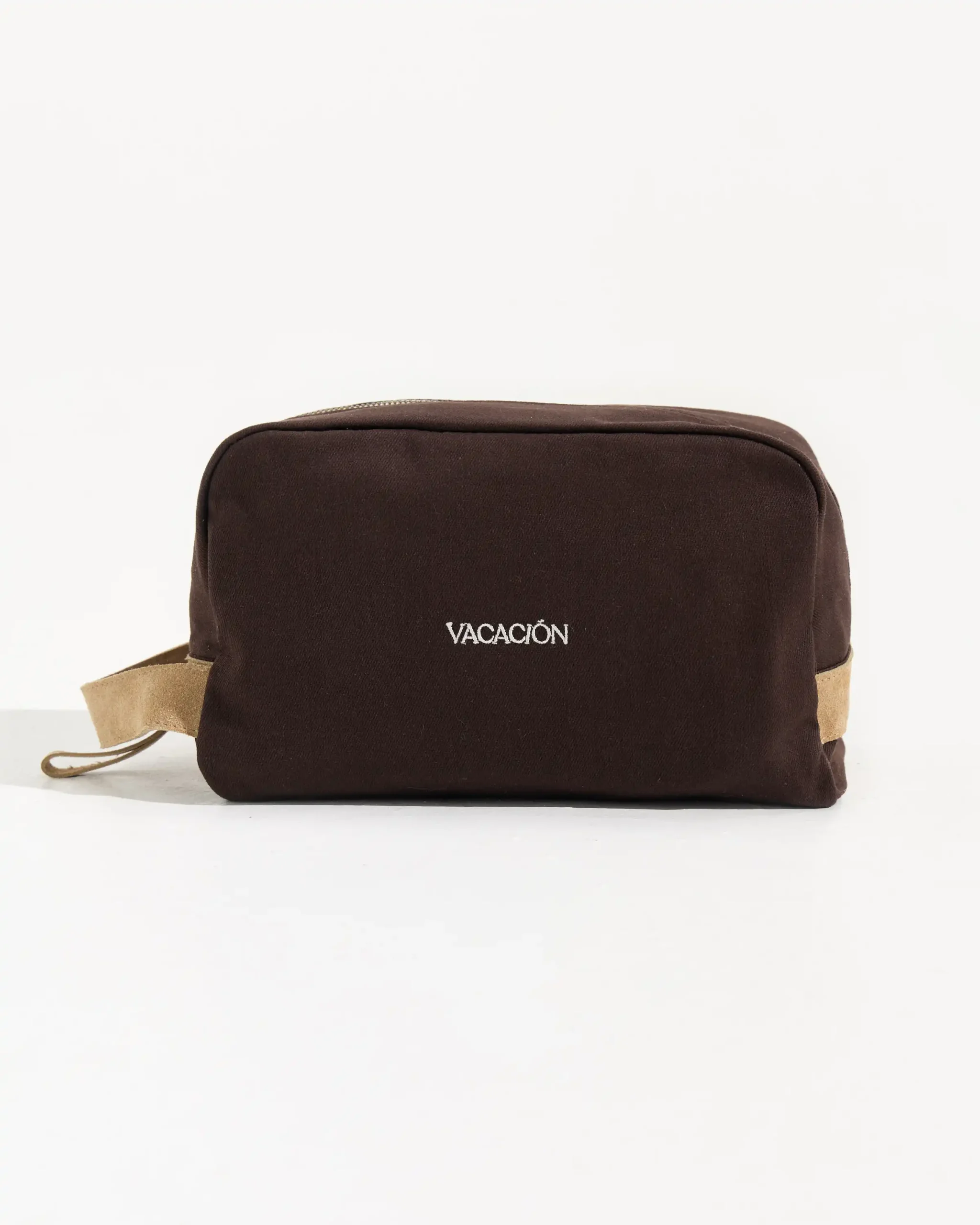 Neceser confeccionado con fibras naturales y detalle de cuero gamuzado. Contiene un boslillo interior.