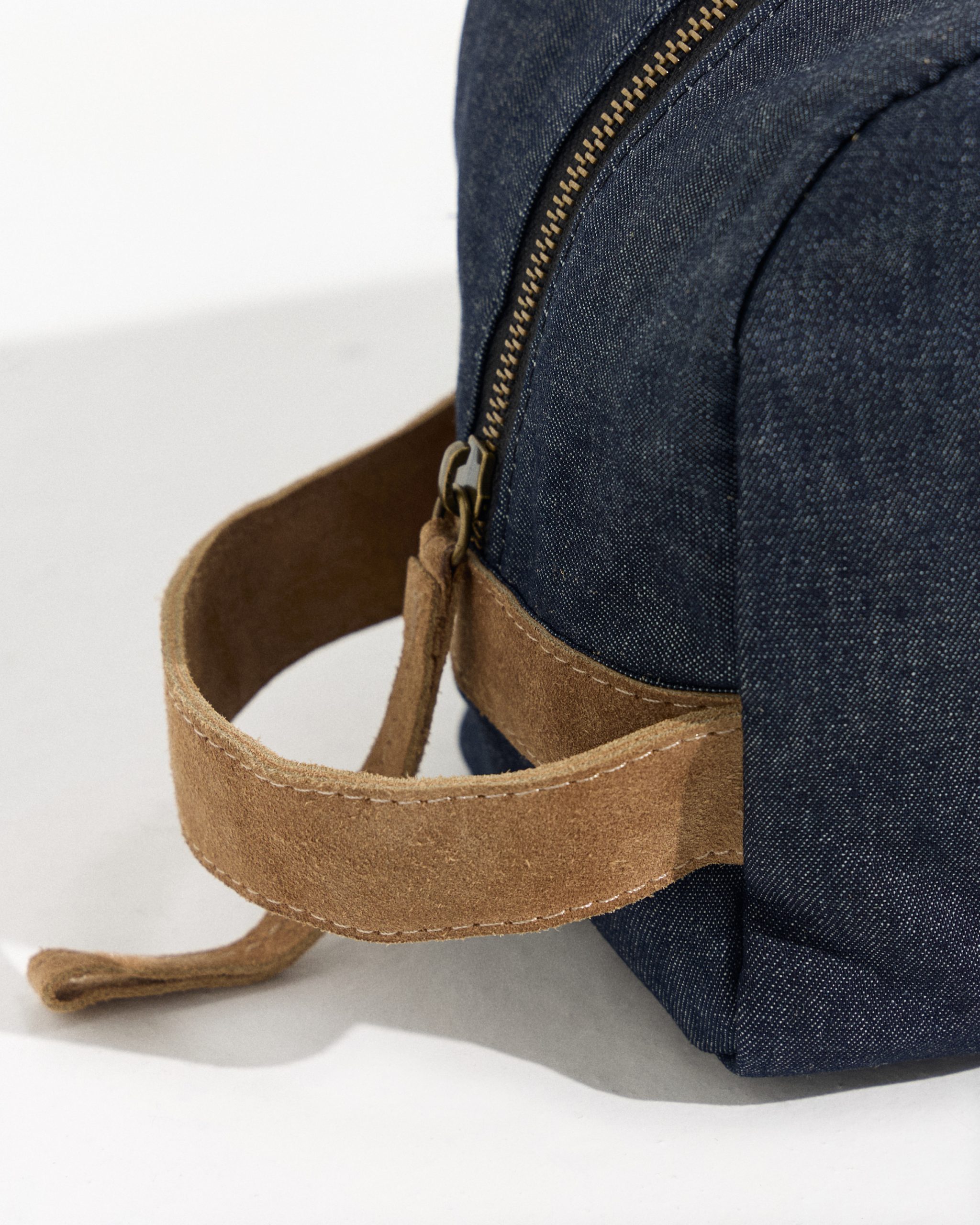 Neceser confeccionado con fibras naturales y detalle de cuero gamuzado